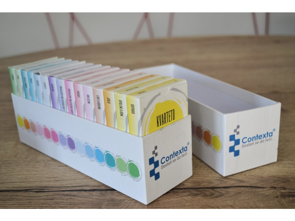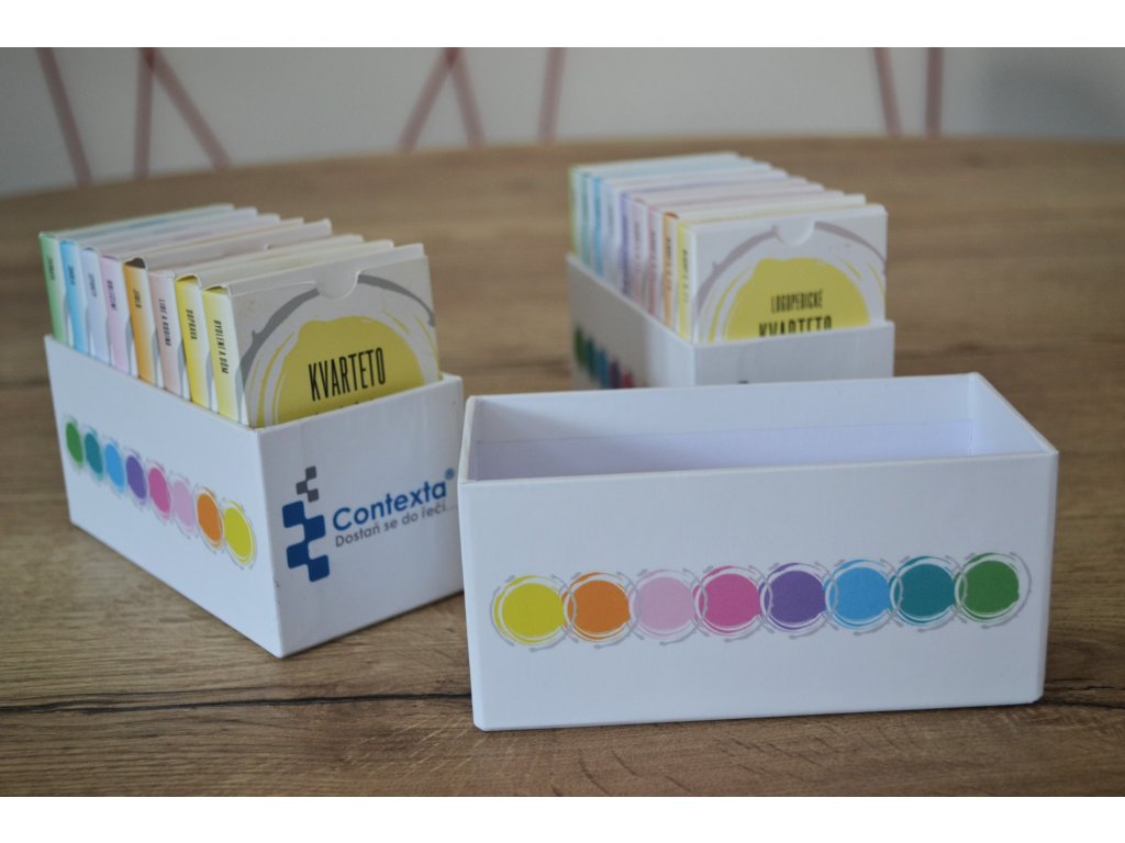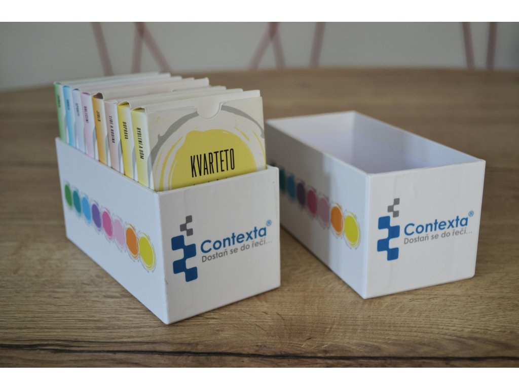 - Větší krabička – vejde se do ní až 15 balíčků kvartet nebo konverzačních karet