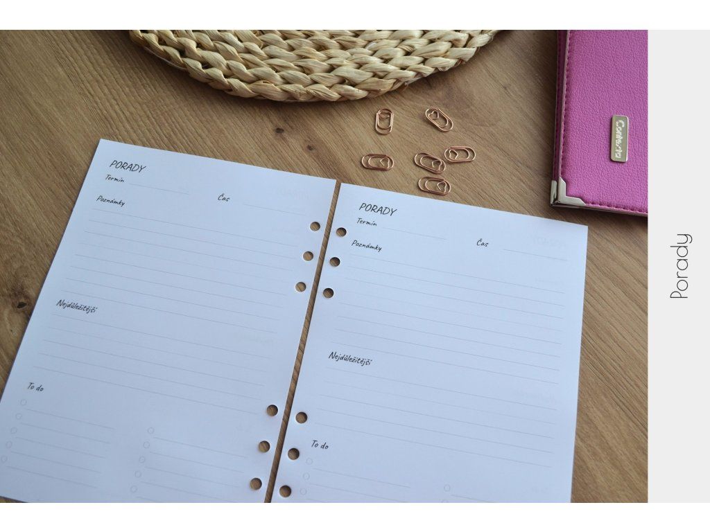 - Porady (10 stran): Všechno, co se říkalo, co je důležité a co je potřeba zařídit – pěkně na jednom místě.
