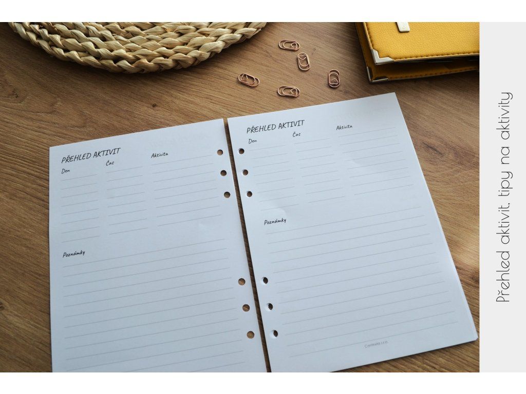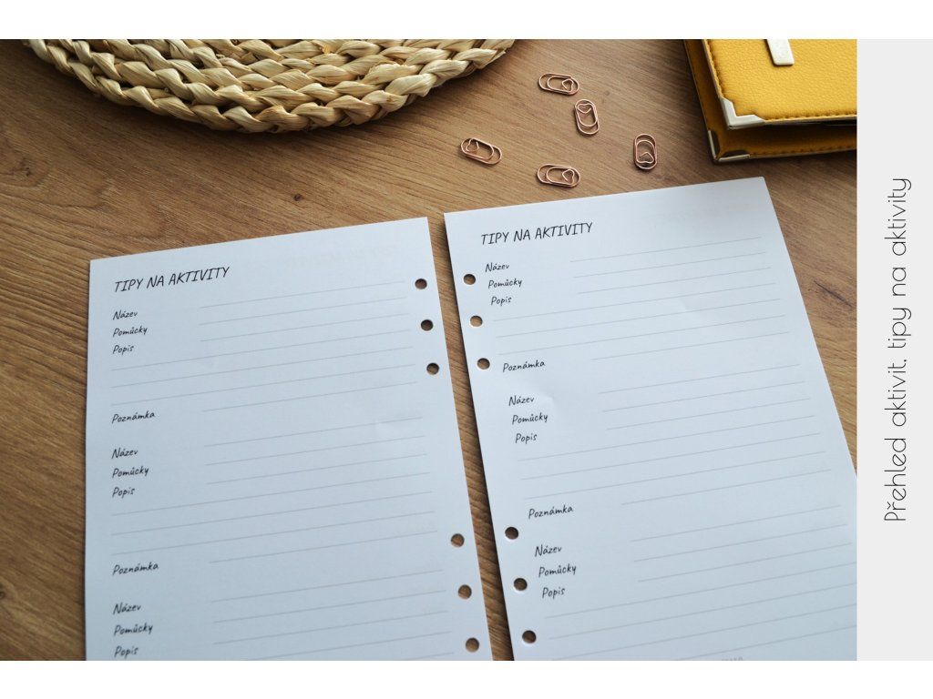 - Přehled aktivit do výuky (16 stran): Sem si zapíšeš všechno, co se Ti osvědčilo, co Tě zaujalo, a dokonce máš zde i prostor pro napsání nových tipů na aktivity, které chceš třeba vyzkoušet, aby nezapadly v hlubinách papírování a shonu.