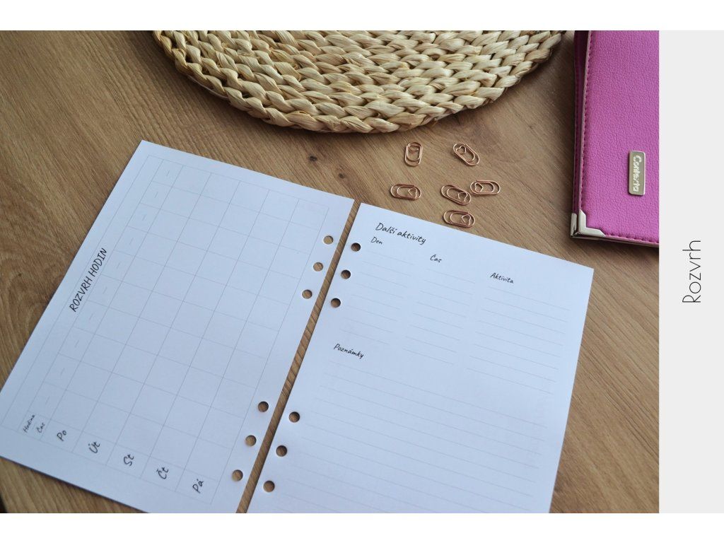 - Rozvrh (10 stran): Kontakty, rozvrhy (i odpolední aktivity), zasedací pořádky a poznámky – přehledně, s místem na všechno.