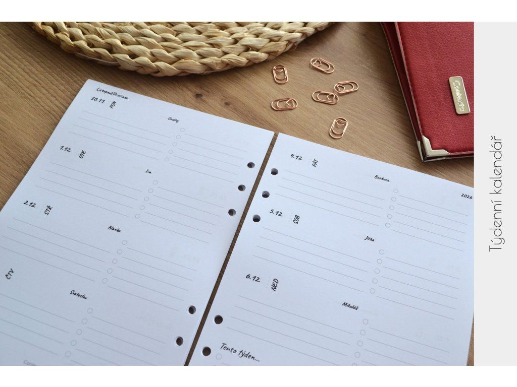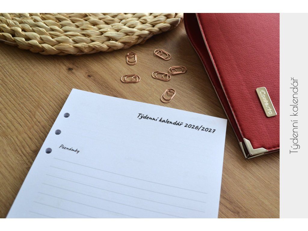 - Týdenní kalendář (108 stran): Jeden týden = dvě stránky, hodně prostoru na poznámky a klidné plánování od srpna do července.