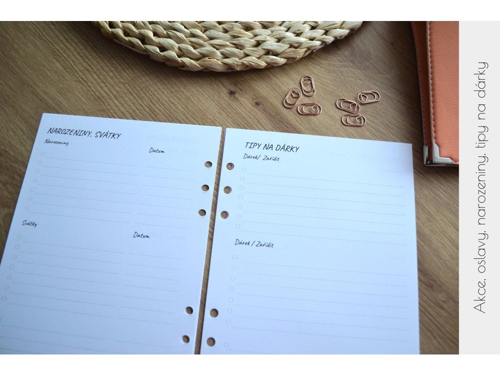 - Akce, oslavy, narozeniny a tipy na dárky (12 stran): Už nikdy nezapomeneš na sportovní akce, výročí, párty, pikniky, oslavu nebo svátky a narozeniny. A rovnou si tu můžeš poznamenat i tipy na dárky či co je potřeba zařídit.