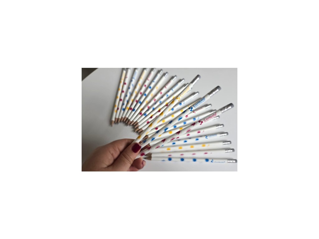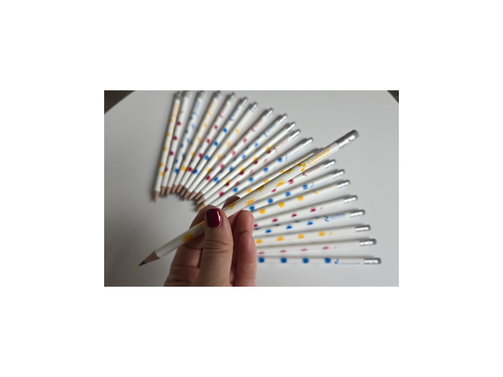Bílé krásky s barevnými kruhy, přijdeme k Tobě ořezané a navíc máme na vrchu gumu (protože víme, že někdy je prostě potřeba začít znovu). Vybrat si můžeš ze tří barevných variant - růžové kruhy, modré kruhy, žluté kruhy. Nejradši ale máme, když jsme pohromadě.